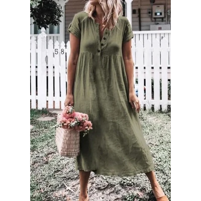 Casual V Neck Solid Loose Shirt Dress Cotton Polyester